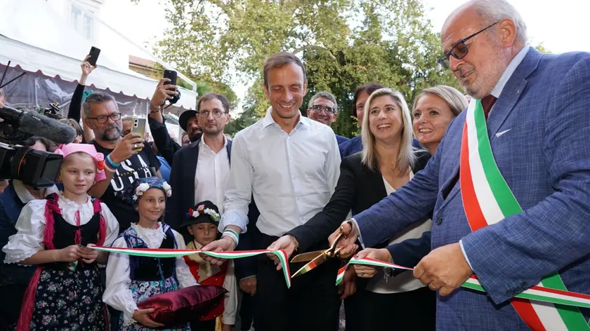 Il sindaco di Gorizia, Rodolfo Ziberna, impegnato nel rituale taglio del nastro sotto lo sguardo del governatore Massimiliano Fedriga