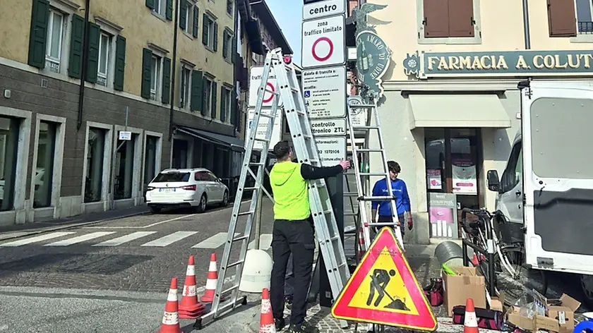 Il cartello di test in via Savorgnana: i tecnici installano il pannello informativo in via Battisti (foto Petrussi)