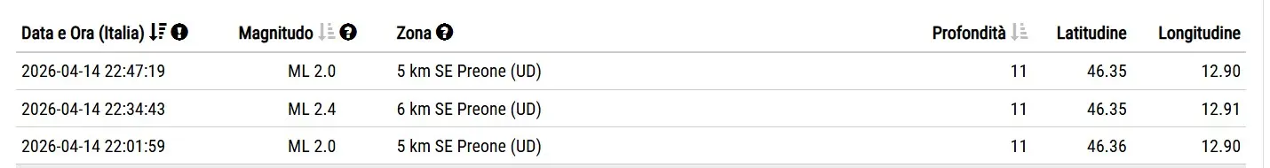 Tre lievi scosse di terremoto sono state registrate in Friuli in meno di un’ora, martedì sera, dalle 22 alle 22.47 a 5 e a 6 chilometri a sud di Preone, in provincia di Udine.