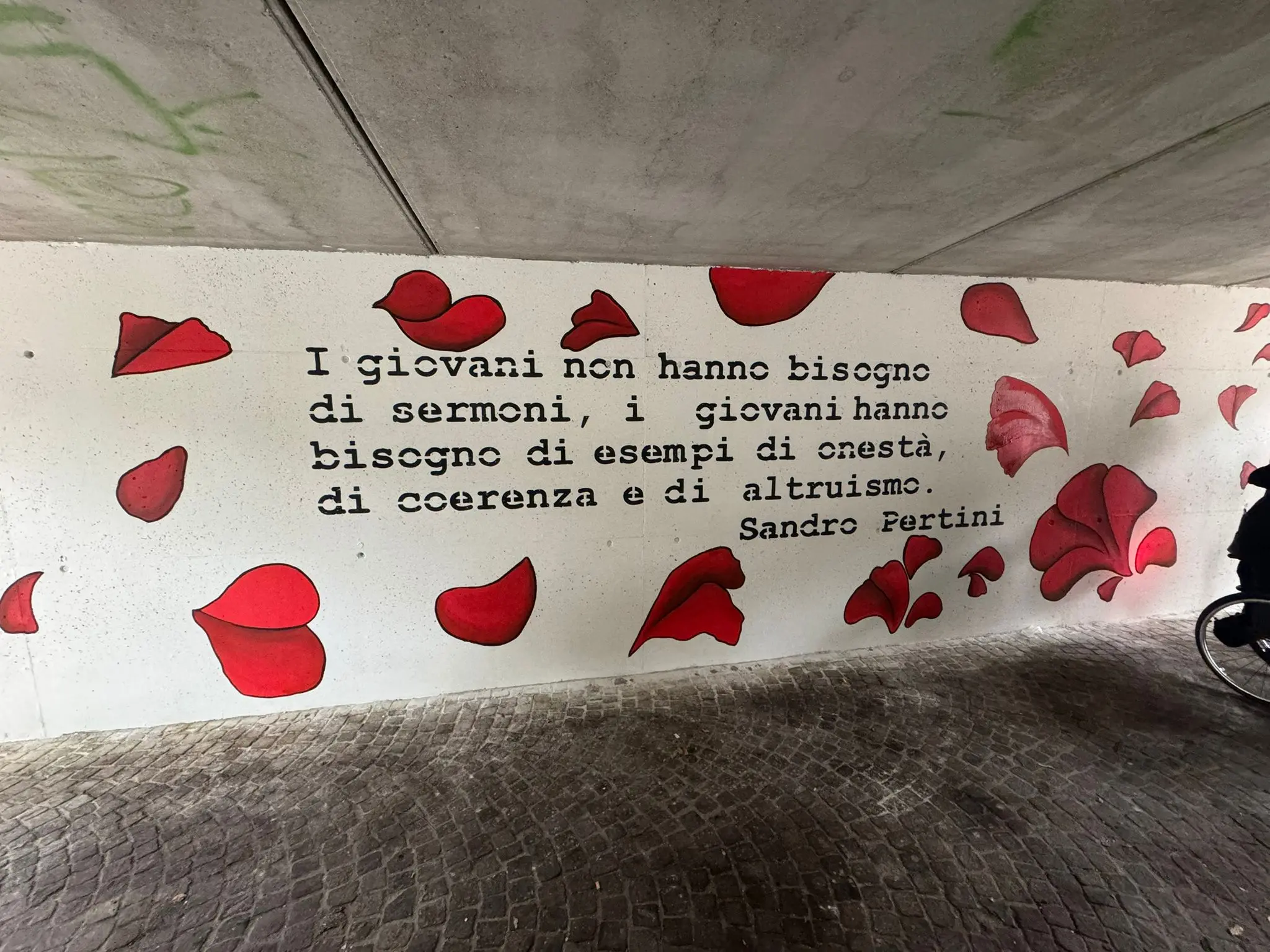 La prima opera d’arte è dunque un omaggio al fu presidente della Repubblica, il suo volto dipinto che osserva, sul lato opposto, una sua citazione storica: “I giovani non hanno bisogno di sermoni, i giovani hanno bisogno di esempi di onestà, di coerenza e di altruismo”.