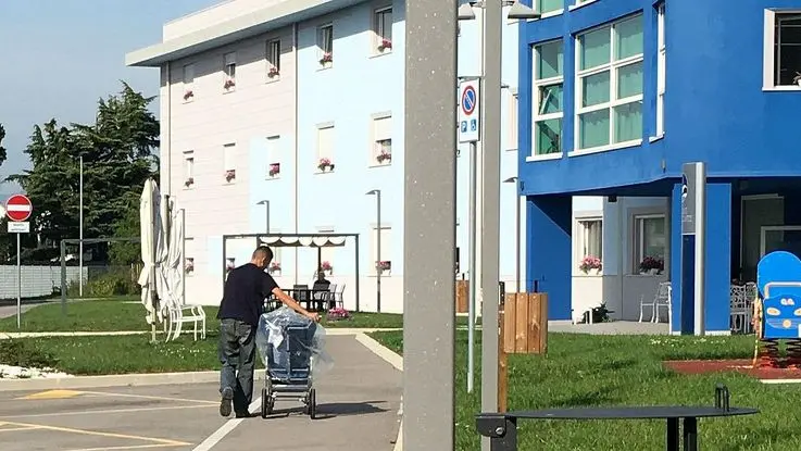 Intorno alle 13, nella strada intitolata alla prima assessore donna del comune alle porte di Udine, il primo a varcare il cancello della recinzione che protegge il palazzone blue e azzurro, è un padroncino. Deve consegnare un pacco, ma dall’interno lo vedono e lo raggiungono appena imbocca il vialetto.