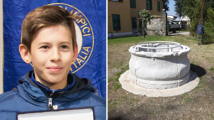 A sinistra Stefano Borghes, a destra il pozzo nel giardino di palazzo Coronini-Cronberg