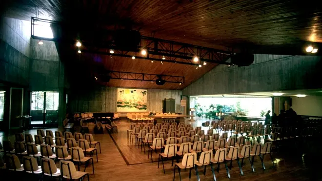 Molti scambiano così per chiesa il vicino condominio che è alto, e sulla facciata ha un timpano e un rosone! Quando poi dal portico si entra nel piccolo atrio e da lì all’interno della chiesa il disorientamento è ancora maggiore perché si cammina su un pavimento tutto di legno e in uno spazio nuovo, nel quale primeggia una scarna e grande mensa, anch’essa di legno. In altre parole, anche l’interno della chiesa, non ha nulla dell’archetipo dello spazio religioso. Eppure proprio di una chiesa si tratta: una Chiesa con la “C” maiuscola, la Ekklesia dei primi cristiani, che con questo termine definivano la comunità dei credenti. Le domus ecclesiae, dove si riunivano, erano grandi case private, con una semplice mensa e un ampio spazio attorno per l’assemblea (deriva da esse anche la chiesa di Aquileia). Non erano templi ma luoghi dove si pregava e si svolgevano altre attività comunitarie.