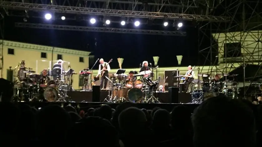 Chissà se è più la nostalgia o la curiosità a far arrivare più di tremila persone, sabato sera a Palmanova, per il concerto dei King Crimson, prima tappa italiana di un tour che celebra 50 anni di carriera. Chissà perché non basta la pioggia a fermare il popolo dei fan, né i chilometri da macinare in macchina, l’attesa ordinata in fila, un caffè o una birra dov’è possibile perché comunque, qualche bar ha deciso di sospendere il servizio, sperando magari di fare qualche incasso in più ai tavoli.