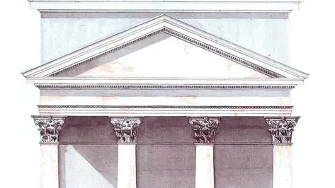 Recentemente è emerso un documento particolare che in qualche modo racconta come fosse la facciata prima dell’intervento del Presani. Si tratta di un ex voto ritrovato nel convento. La scena, dipinta su una semplice tavola di abete, narra un evento svoltosi in quella che oggi è piazza Primo maggio. Si vedono quattro cavalli con altrettanti cavalieri e sembra ci sia in atto una lotta, visti i bastoni levati in aria, ma potrebbe trattarsi anche di un più modesto imbizzarrimento delle bestie, o dei loro padroni, oppure di tutti. Fatto sta che in mezzo si trova una donna, la probabile beneficiata dalla grazia, che allarga le braccia in segno di impotenza. Sullo sfondo a sinistra si vede la chiesa come doveva essere dopo l’intervento di Giorgio Massari, con facciata in mattoni e finestroni. Il pronao del Presani è in costruzione, si scorge una colonna di tre metri e un’altra appena impostata e tutt’intorno una primitiva impalcatura in legno. La data è il 1840 e le cronache ci dicono che il Presani aveva appunto iniziato il lavoro nel 1838. L’archivio del convento ci rivela ancora che la pietra d’Istria arrivò dall’isola di Brioni al porto di San Giorgio di Nogaro e i parrocchiani aprirono una sottoscrizione per finanziare i lavori. Ma nel 1852 il deputato d’ornato, il famoso architetto Andrea Scala, contestò gli errori di esecuzione della facciata e soprattutto l’erta scalinata frontale, per cui un riatto fu eseguito nel 1871. —