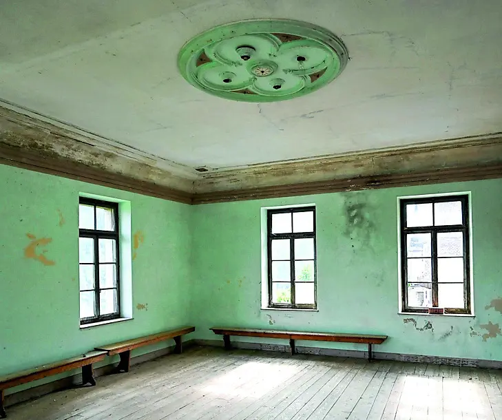 Guardando gli stucchi del lampadario, la luce che filtra dalle finestre, si capisce quanto fosse forte il gusto della bellezza, della cura nel costruire le “cose” per la comunità. Sotto la sala del Cral c’era la latteria sociale, luogo d’incontro dove ogni giorno si pesava il latte due volte. Da anni inseguo le latterie. Le riconosco passando per i paesi: nella forma degli edifici, nelle scritte ancora visibili — Latteria sociale, Turnaria — o nei segni ormai sbiaditi sui muri. Molte non esistono più: sono diventate alberghi, sedi di associazioni o abitazioni private. Altre resistono solo nella memoria, conservate nelle mie fotografie con i racconti di chi, tra stalle e caldaie, trasformava il latte in vita. In Friuli ho percorso le strade alla ricerca di queste tracce. Nella mia Carnia ho fotografato per il libro Malghe e Malgari le ultime piccole latterie ancora aperte: a Cabia, a Illegio, dove si sentivano gli ultimi rumori del latte. Ora rimangono solo le grandi latterie di vallata, come a Sutrio e a Enemonzo. In Val Pesarina, quando ho iniziato i la mia ricerca, erano già tutte chiuse. Ogni frazione aveva la sua: edifici belli, costruiti per la comunità, spesso con la scuola o il Cral al piano superiore. A Osais, la comunità ha voluto mantenere viva la memoria restaurando la vecchia latteria com’era: con le caldaie di rame, gli oggetti, le tracce di un lavoro condiviso. A Pesariis, invece, l’edificio è stato trasformato, ma dietro un vetro una piccola caldaia continua a raccontare una storia antica.