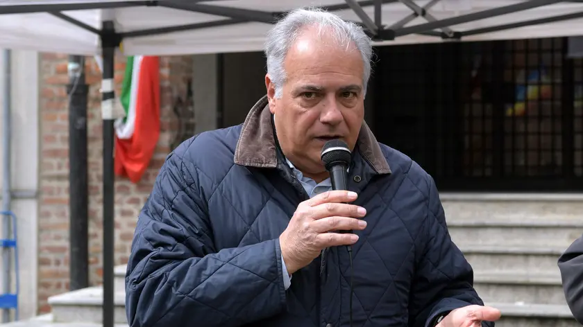 Roberto Salis, padre di Ilaria Salis al presidio organizzato da Anpi per chiedere la liberazione di Ilaria Salis a Melegnano. 28 Aprile 2024. ANSA/ANDREA CANALI