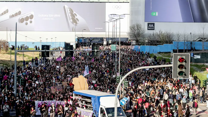 (ANSA) - MILANO, 08 MAR - "Disarmiamo guerra e patriarcato" è il grande striscione con cui si è aperto il corteo organizzato da Non una di meno in occasione dell'8 marzo a Milano. Un corteo a cui hanno partecipato almeno diecimila persone che da piazza Duca d'Aosta sono arrivate a piazza Fontana con cartelli contro la guerra e anche contro il ddl Buongiorno. Un grande poster con scritto 'Senza consenso è stupro, senza dissenso è fascismo' è stato affisso al grattacielo Pirelli, sede del Consiglio regionale. Sulle vetrine di un locale vuoto, sono stati attaccati manifesti con il simbolo di Microsoft e la scritta molestatore, con il simbolo di Tesla ma a testa in giù e altri sugli Epstein secret, e uno con Trump a testa in giù e la scritta 'Make Fascist Afraid Again', ovvero fate che i fascisti abbiano ancora paura. Alcuni dei manifestanti, dell'ala antagonista, sono entrati nel cantiere e saliti sul Pirellino, l'ex edificio venduto dal Comune al gruppo Coima che rientra nella maxi inchiesta sull'urbanistica, e hanno srotolato uno striscione con scritto: "Viva gli spazi sociali. Occupiamola, che sia la nostra città". (ANSA).