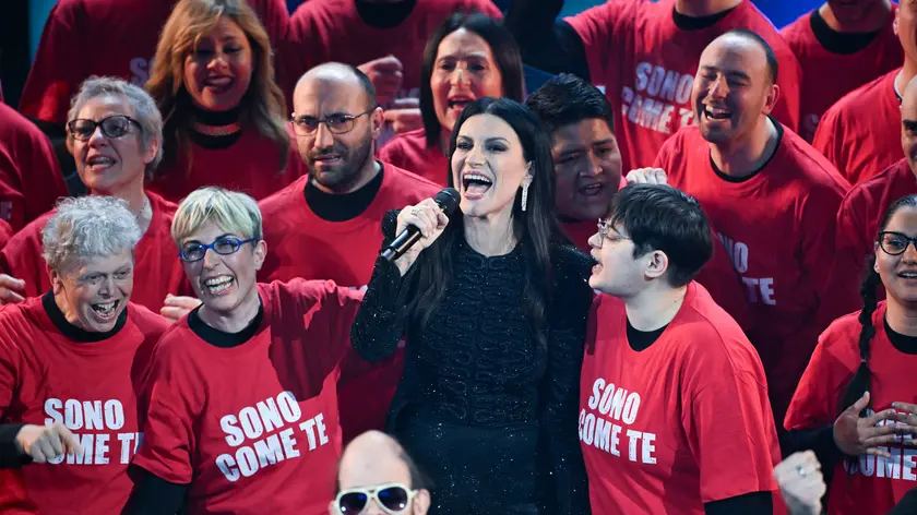 (ANSA) - SANREMO, 25 FEB - Si può dare di più: la canzone che trionfò su questo palco nel 1987, cantata da Gianni Morandi, Umberto Tozzi ed Enrico Ruggeri, assume un nuovo valore simbolico interpretata all'Ariston dal coro della sezione de La Spezia dell'Anffas, l'Associazione Nazionale di Famiglie e Persone con disabilità intellettive e disturbi del neurosviluppo. Con il gruppo, che non trattiene l'entusiasmo e viene premiato dall'applauso del pubblico, canta anche Laura Pausini. "Alla faccia dei leoni da tastiera, sul palco stasera con noi c'è Laura Pausini", dice uno di loro. E lei commenta: "Chi crede nei sogni può realizzarli". E un altro ringrazia l'orchestra imitando Paolo Villaggio: "Come siete umani". (ANSA).