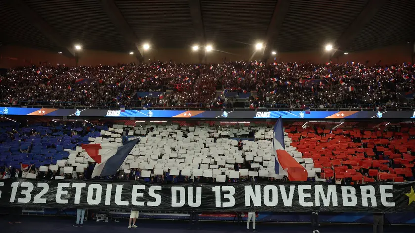 (ANSA) - PARIGI, 13 NOV - Emozionante omaggio del Parco dei Principi, questa sera, prima dell'inizio di Francia-Ucraina, valevole per le qualificazioni alla Coppa del Mondo, per i 10 anni dagli attentati terroristici del 13 novembre 2015. Riprendendo il simbolo delle stelle proposto appena prima della partita dalla cerimonia ufficiale di inaugurazione del Giardino del Ricordo, all'Hotel de Ville - con 132 stelle, una per ogni vittima di quella sera, che si sono accese nel cielo di Parigi - i tifosi hanno esposto un grande striscione dedicato "alle nostre 132 stelle del 13 novembre". Commosso, in tribuna, l'ex presidente François Hollande, che era allo stadio (ma allo Stade de France di Saint-Denis) 10 anni fa, alla stessa ora, per l'amichevole Francia-Germania, interrotta nel primo tempo per un'esplosione fuori dall'impianto, causata dai terroristi che non erano riusciti ad entrare all'interno. Allo Stade de France, ci fu soltanto una vittima di quegli attentati, l'autista di un bus parcheggiato vicino al luogo dell'esplosione, che aspettava l'uscita dei tifosi. Durante l'esecuzione dell'inno nazionale, i tabelloni del Parco dei Principi hanno diffuso le immagini della tour Eiffel, stasera illuminata di blu-bianco-rosso, i colori della Francia, con la parola "Liberté" sulla destra. Poi, è stata la volta del minuto di silenzio, rispettato da tutti fino in fondo. Al 16/o minuto, quando si fermò per l'esplosione udita all'interno dello stadio la partita di 10 anni fa, i 45.000 spettatori presenti stasera al Parco dei Principi hanno acceso le luci dei loro cellulari, mentre in tribuna veniva mostrato lo striscione "alle 132 stelle del 13 novembre". (ANSA).