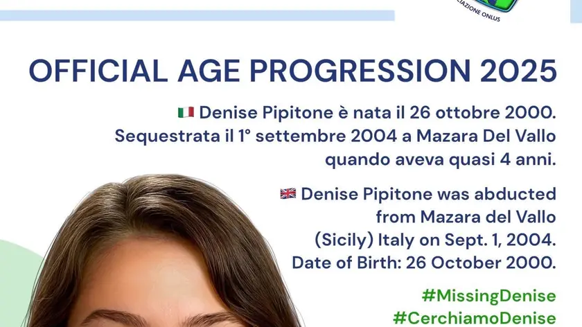 (ANSA) - PALERMO, 26 OTT - Denise Pipitone, la bambina scomparsa da Mazara del Vallo (Trapani) l'1 settembre 2004 a 4 anni, oggi compie 25 anni. Il padre biologico, Pietro Pulizzi, in un messaggio su Facebook scrive: "Denise, amore mio, oggi è il tuo compleanno e il mio cuore è pieno di nostalgia e di amore per te. Anche se sono passati 21 anni senza averti al mio fianco, ogni giorno è stato un'eternità senza la tua presenza. Spero che tu sia felice e che la tua vita sia piena di luce e di gioia. Ti voglio bene, papà Pietro". In un altro messaggio congiunto la madre Piera Maggio e Pulizzi scrivono: "Denise, ci manchi tantissimo. Ovunque tu sia, sappi che la tua famiglia ti ama con tutto il cuore e non smetteremo mai di cercarti, la nostra forte speranza è di poterti riabbracciare presto. I tuoi genitori". In questi giorni è stato reso noto l'ultimo "age progression" della bambina. In un messaggio alla città il sindaco Salvatore Quinci dice: "Strappata all'affetto dei suoi cari quando aveva solo 4 anni in una calda giornata di settembre Denise Pipitone compie oggi 25 anni. Il primo settembre, giorno del rapimento, ed il 26 ottobre, giorno del compleanno di Denise sono date che riportano alla memoria un dramma tuttora vissuto in primis dai suoi genitori e cari a cui si aggiunge un senso d'ingiustizia, il sogno di potere un giorno riabbracciare Denise, la speranza che ignara e non memore di quanto accaduto viva una vita felice in qualche parte del mondo. (ANSA).