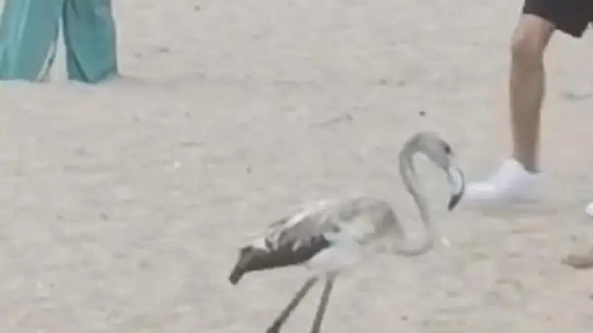 Fenicottero a passeggio sulla spiaggia di Senigallia