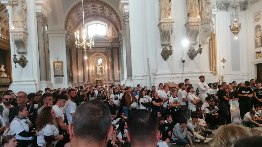 (ANSA) - PALERMO, 16 OTT - Cattedrale di Palermo stracolma per i funerali di Paolo Taormina, ucciso nella notte tra sabato e domenica. Sulla bara bianca sono poggiati due cuori di rose bianche e rosse con le iniziali del giovane, P. T. La bara è circondata dagli amici del giovane, seduti a terra, con le gambe incrociate. Indossano una maglietta con una foto che ritrae Paolo e la scritta "Sarai per sempre nei nostri cuori". (ANSA).