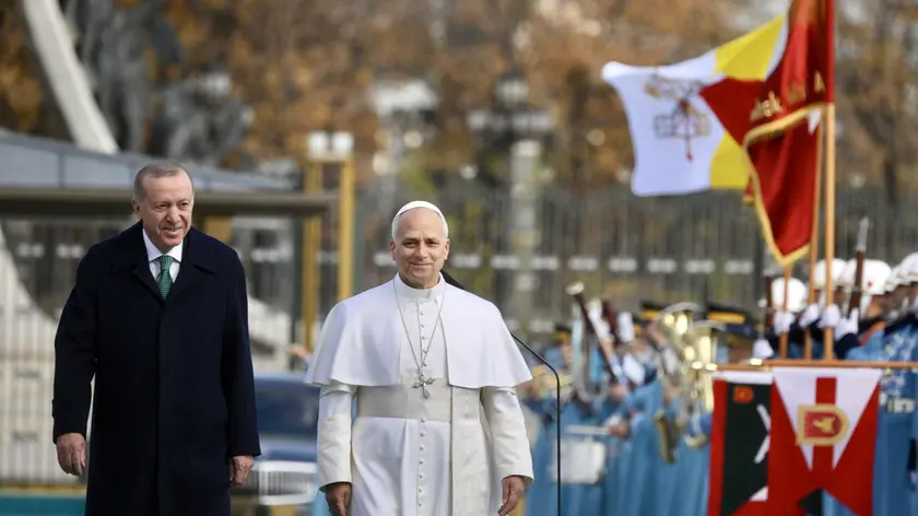 (ANSA) - ANKARA, 27 NOV - Il Papa auspica che la Turchia "possa essere un fattore di stabilità e di avvicinamento fra i popoli, a servizio di una pace giusta e duratura". La Santa Sede "desidera cooperare a costruire un mondo migliore con l'apporto di questo Paese, che costituisce un ponte tra Est e Ovest, tra Asia ed Europa". "Oggi più che mai c'è bisogno di personalità che favoriscano il dialogo e lo pratichino con ferma volontà e paziente tenacia", ha detto alle autorità. "Stiamo attraversando una fase fortemente conflittuale a livello globale, in cui prevalgono strategie di potere economico e militare, alimentando quella che Papa Francesco chiamava 'terza guerra mondiale a pezzi'. Non bisogna cedere in alcun modo a questa deriva!". (ANSA).