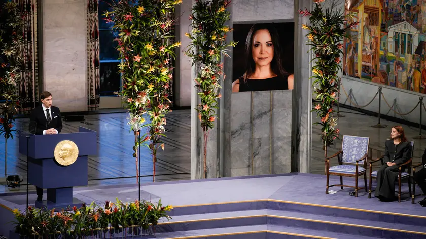 (ANSA) - ROMA, 10 DIC - La leader dell'opposizione venezuelana, Maria Corina Machado, vincitrice del Premio Nobel per la Pace di quest'anno, condanna il 'terrorismo di stato' del governo venezuelano. In un discorso pronunciato dalla figlia, che ha ritirato il premio in sua assenza a Oslo, Machado ha sottolineato che 2.500 persone sono state 'rapite, fatte sparire e torturate' sotto il regime del presidente Nicolas Maduro. 'Si tratta di crimini contro l'umanità, documentati dalle Nazioni Unite. Terrorismo di stato, messo in atto per seppellire la volontà del popolo', ha dichiarato la figlia di Machado, Ana Corina Sosa Machado. (ANSA).