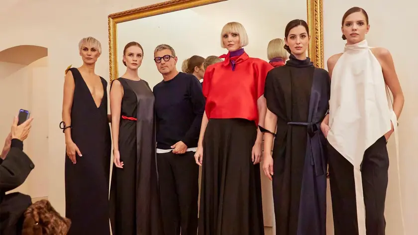 (ANSA) - ROMA, 16 NOV - Il cerchio, il triangolo, il quadrato, sono le forme geometriche pure che riportano all'infanzia di Vittorio Camaiani, lo stilista di San Benedetto del Tronto che ha svelato la sua nuova collezione Autunno/Inverno 25-26, intitolata "La mia Strada", nella settecentesca Coffee House di Palazzo Colonna. Il defilè si è svolto in concomitanza della mostra "Seduzioni, quando il metallo diventa desiderio", le sculture di Andrea Borga in dialogo con gli abiti di 13 maison, in presenza della principessa Jeanne Colonna, e con la presentazione di Elena Parmegiani, direttrice eventi della Coffee Hause di Palazzo Colonna e della Galleria del Cardinale. Come in un viaggio surreale a ritroso nel tempo che ci riporta allo sguardo dell'infanzia, la collezione trae spunto dalle forme primarie che impariamo a riconoscere da bambini, il cerchio, il quadrato, il triangolo, unite ai desueti tocchi di surrealismo e futurismo, amati da Camaiani e sempre presenti nelle sue proposte. La collezione accompagna il giorno e la sera attraverso linee rigide ma inaspettatamente in sintonia con le forme del corpo femminile. Gonne e pantaloni sono in tessuti che abbinano la morbidezza del cachemire e della seta e materiali più corposi come le lane e il cotone. Le camicie, cavallo di battaglia di Camaiani, spesso si ricoprono di fantasie geometriche e di pois, ma assumono forme di triangoli d'immaginari aquiloni, o di cerchi schiacciati sulle maniche. Anche le giacche in cachemire hanno una forma arrotondata e sono tagliate asimmetricamente da zip in metallo. I bermuda sembrano uscire da una tela futurista. Blazer e completi pantaloni in lana sono in principe di Galles o in pied de poule. Infine, gli abiti da sera partono dalla forma rigida del rettangolo, ma si ammorbidiscono sul corpo grazie alle cinture strette in vita. Immancabile la tuta per il giorno in lana e in principe di Galles illuminata da satin per le serate leganti. Rettangoli e triangoli anche nelle piccole casacche in duchesse e doppio raso nei color block giallo, verde e rosso traslati su lunghi abiti. La palette cromatica della collezione vira dai colori accesi, anch'essi evocativi dell'infanzia, come il giallo, il rosso e il verde fino ai toni terra del cammello e del marrone e ai blu fino al nero. Accessori. Le calzature realizzate da Lella Baldi per lo stilista sono per il giorno sono modelli flat maschili all'inglese e per la sera sandali con tacchi altissimi. I cappelli, realizzati da Jommi Demetrio, sono baschi nelle nuanches cromatiche della collezione con sfumature degradè e ricamati per la sera. (ANSA).