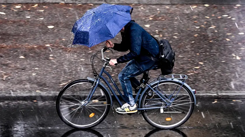 epa10773862 A cyclist uses an umbrella as he rides through heavy rain in Berlin, Germany, 28 July 2023. EPA/Filip Singer