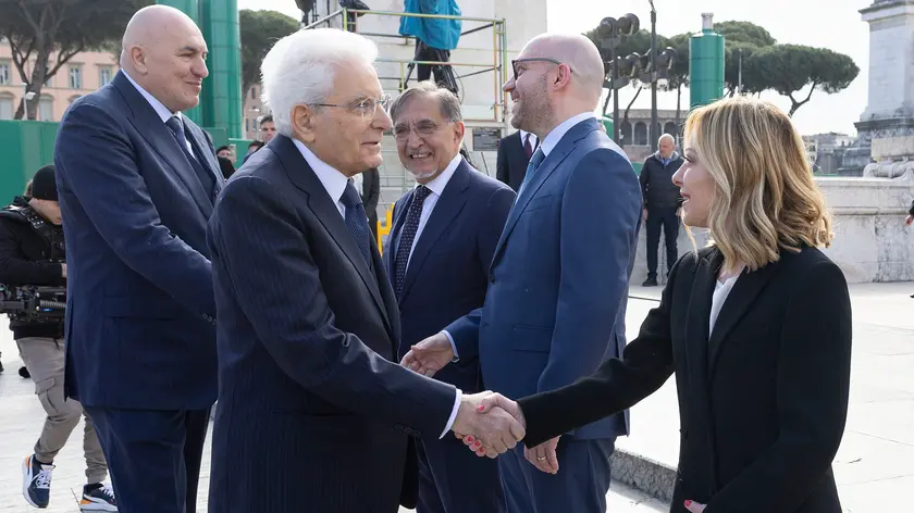 Il Presidente Sergio Mattarella saluta Giorgia Meloni, Presidente del Consiglio dei Ministri, in occasione della deposizione di una corona d’alloro sulla Tomba del Milite Ignoto, nel 79° anniversario della Liberazione (foto di Francesco Ammendola - Ufficio per la Stampa e la Comunicazione della Presidenza della Repubblica)