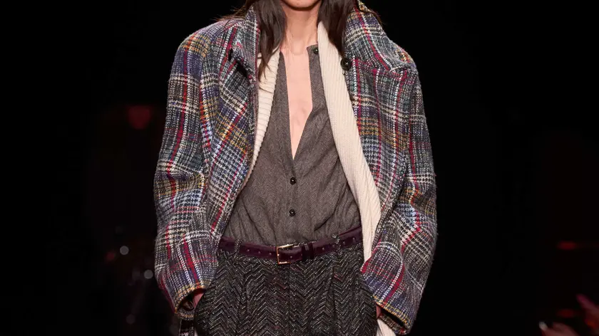 (ANSA) - MILANO, 25 FEB - Lo stile chic e disinvolto delle 'sciure' milanesi ha ispirato Alberto Caliri per la collezione per il prossimo inverno di Missoni, in passerella oggi a palazzo Mezzanotte, sede della Borsa. Uno stile quotidiano fatto di Blouson in maglia e pantaloni dal taglio maschile con le pinces, anche proposti in maglia e con un filo metallico a illuminarne la trama. In passerella nessuna gonna ma tanti abiti trompe l'oeil che sembrano composti da blouson e sottana mentre sono un pezzo unico. Sussurrati i motivi della maison come il celebre zig zag che si stempera nel tweed dei cappotti dalle spalle ampie e nei bomber di maglia. Una collezione nel segno della "continuità e dell' evoluzione delle linee ma senza strappi": chiosa Caliri, spiegando di aver voluto portare il giorno anche nella sera con le maglie e gli abiti in jacquard tridimensionale con inserti di paillettes. Tutto immediato perché "Metti e levi - conclude il designer- è la filosofia del brand". (ANSA).