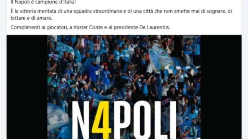 (ANSA) - ROMA, 23 MAG - A Napoli è festa scudetto. Al triplice fischio dell'arbitro è stata irrefrenabile la gioia esplosa in piazza Plebiscito dove migliaia di tifosi hanno assistito alla partita attraverso il maxi schermo. E a illuminare la festa di popolo, i fuochi d'artificio. Novanta minuti in cui il clamore della piazza non si è mai arrestato. Fumogeni, trombette, bandiere al vento, urla di suspence ad agni azione degli azzurri e gioia esplosa ai due goal con cui il Napoli ha messo il sigillo sul suo quarto scudetto. Uno scudetto conquistato all'ultimo respiro, all'ultima giornata di un campionato che visto sfidarsi Napoli e Inter. Ma ora e per tutta la notte la città di Napoli festeggerà. "È successo! Il Napoli è campione d'Italia! È la vittoria meritata di una squadra straordinaria e di una città che non smette mai di sognare, di lottare e di amare. Complimenti ai giocatori, a mister Conte e al presidente De Laurentiis". Lo scrive su Facebook il sindaco di Napoli, Gaetano Manfredi. Intanto sulla facciata di Palazzo San Giacomo, la sede del Comune, è stato esposto il quarto scudetto. (ANSA).