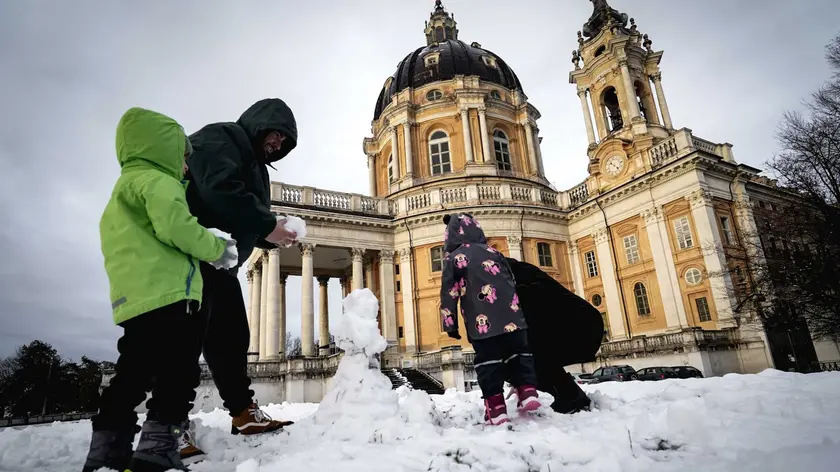 Neve sulla collina di Torino, a Superga i bambini costruiscono pupazzi