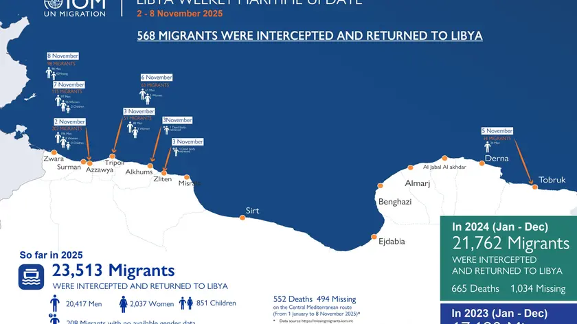 - TUNISI, 11 NOV - Almeno 552 persone sono morte e 494 risultano disperse sulla rotta del Mediterraneo centrale dall'inizio dell'anno all'8 novembre. Lo rende noto l'Organizzazione internazionale per le migrazioni (Oim) in Libia nel suo ultimo aggiornamento pubblicato su X. Nello stesso periodo, precisa l'agenzia dell'Onu, i migranti intercettati in mare e riportati in Libia sono stati 23.513, di cui 20.417 uomini, 2.037 donne, 851 minori e 208 di cui non si conoscono i dati di genere.
