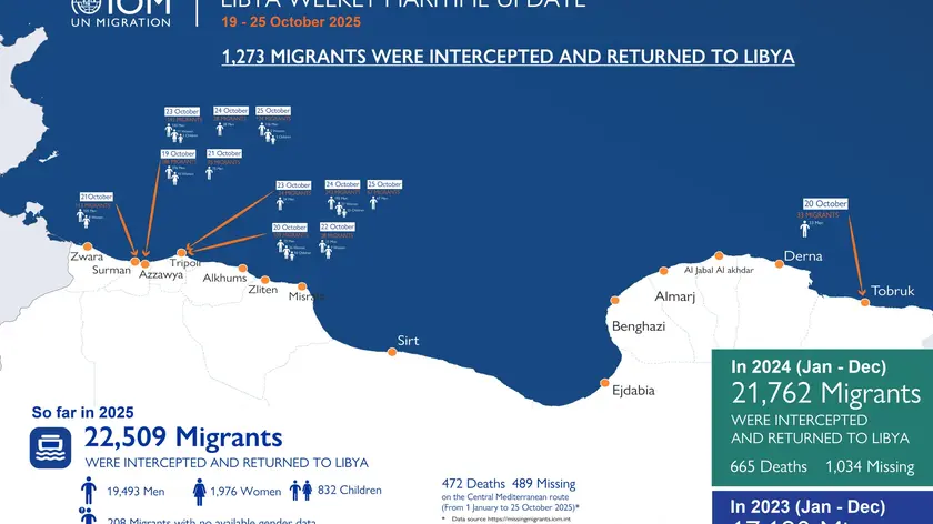 - TUNISI, 28 OTT - Almeno 472 persone sono morte e 479 risultano disperse sulla rotta del Mediterraneo centrale dall'inizio dell'anno al 25 ottobre. Lo rende noto l'Organizzazione internazionale per le migrazioni (Oim) in Libia nel suo ultimo aggiornamento pubblicato su X. Nello stesso periodo, precisa l'agenzia dell'Onu, i migranti intercettati in mare e riportati in Libia sono stati 22.509, di cui 19.493 uomini, 1.976 donne, 832 minori e 208 di cui non si conoscono i dati di genere.
