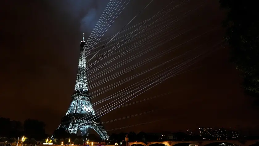 epa11498168 The Eiffel Tower is illuminated by a light show during the Opening Ceremony of the Paris 2024 Olympic Games, in Paris, France, 26 July 2024. EPA/DAVID DAVIES / POOL