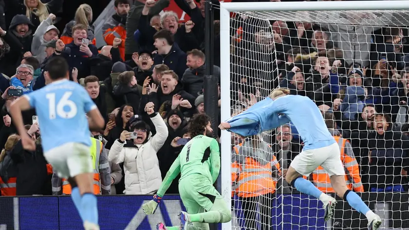 (ANSA) - ROMA, 08 FEB - Il Manchester City batte 2-1 il Liverpool e riaccende le proprie speranze di titolo in Premier League. Determinante il rigore trasformato da Erling Haaland nei minuti di recupero. La squadra di Pep Guardiola riduce a sei punti il proprio svantaggio dall'Arsenal in vetta alla Premier League. A sei minuti dalla fine, il City si avviava verso la sconfitta ad Anfield, prima che Bernardo Silva annullasse lo straordinario calcio di punizione di Dominik Szoboszlai, dando il via a un finale incredibile. Haaland ha portato in vantaggio il City su rigore prima che agli ospiti venisse annullato un altro gol. Szoboszlai è stato espulso nello stesso episodio dopo una revisione del VAR. (ANSA).