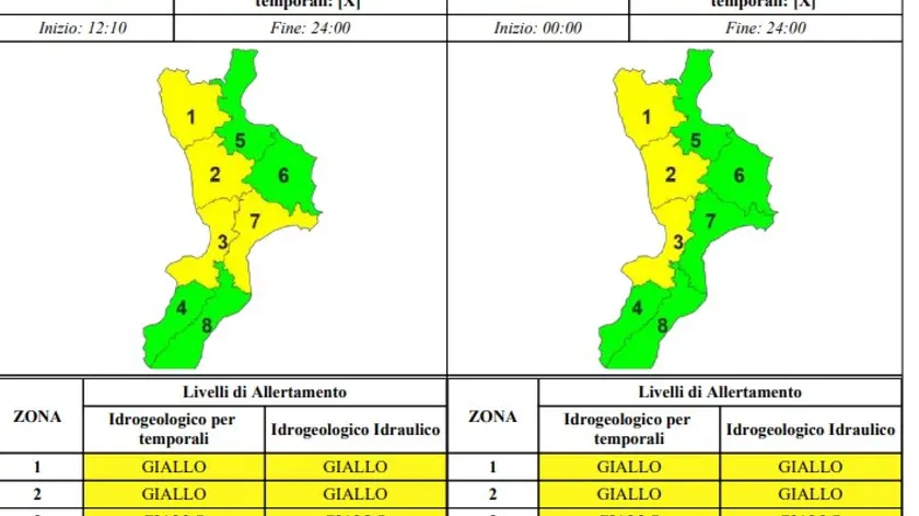 (ANSA) - CATANZARO, 06 FEB - E' stato ridotto da arancione a giallo, esteso anche alla fascia ionica catanzarese, il livello d'allerta per l'ondata di maltempo che sta interessando la Calabria. La Protezione civile regionale, inoltre, per domani prevede un'allerta gialla per la fascia tirrenica del Cosentino, del Catanzarese e del Vibonese. Sono previste precipitazioni sparse e vento forte. (ANSA).