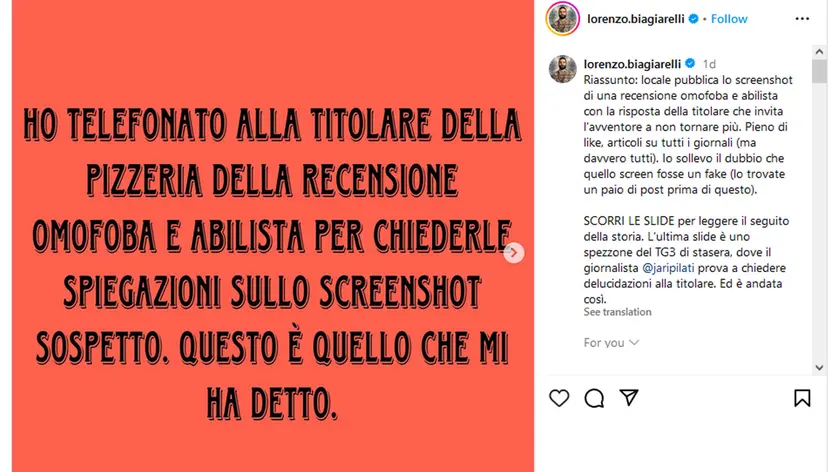 MILANO, 15 GEN - Lorenzo Biagiarelli, l'influencer che per primo ha esternato dei dubbi sull'autenticità della recensione del presunto cliente che protestava per la presenza di gay e disabili ad un tavolo della trattoria di Giovanna Pedretti, trovata morta ieri, respinge con forza le accuse di 'odio social' e 'shistorm'. "Mi dispiace che pensiate che la ricerca della verità possa avere queste conseguenze - scrive nella storia su Ig Biagiarelli -. Ci tengo a respingere con forza le accuse di 'odio social' e 'shitstorm' dal momento che la signora Giovanna, in questi due giorni, non ha ricevuto dalla stampa che lodi e attestazioni di stima, e solo qualche sparuto e faticoso tentativo di ristabilire la verità che, in ogni caso, non ha e non avrebbe mai avuto pari forza". "Mi dispiace moltissimo delle morte della signora Giovanna e il mio pensiero va alla sua famiglia", scrive Biagiarelli ma invita "a riflettere sulle conseguenze del tentativo "di ristabilire la verità". "Se si dovesse temere sempre questo epilogo a questo punto dovremmo chiudere tutto, giornali e social". Scrivere cose false "è pericoloso" possono accadere "tragedie" e non si deve dare la responsabilità a chi ristabilisce la verità, ha aggiunto Selvaggia Lucarelli, anche lei di nuovo sui social. "Nessuno si pone mai il problema a monte - prosegue Lucarelli - e cioè che scrivere cose non vere può essere pericoloso, poi accade una tragedia (in cui nessuno ovviamente pensa che contino anche il contesto, la vita, i pregressi) ed è colpa di chi ristabilisce la verità. In pratica, siamo arrivati al punto che dare una notizia non è più una responsabilità. Correggerla sì. Altro che black mirror". (ANSA).