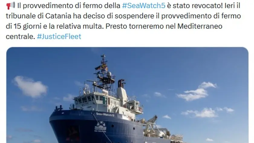 (ANSA) - CATANIA, 19 FEB - "Il provvedimento di fermo della Sea Watch 5 è stato revocato. Ieri il tribunale di Catania ha deciso di sospendere il provvedimento di fermo di 15 giorni e la relativa multa. Presto torneremo nel Mediterraneo centrale". Lo scrive la Ong sui propri canali social. Il provvedimento di fermo era stato emesso dopo un'operazione di salvataggio di 18 persone, compresi due bambini, lo scorso 25 gennaio con l'assegnazione di Catania come porto sicuro. L'intervento spiega la ong, era avvenuto in acque internazionali, nella zona Sar libica, e la sanzione sarebbe stata disposta dalle autorità italiane perché non avrebbe comunicato alle autorità libiche le posizioni di soccorso. Una scelta adottata dalla Sea Watch 5, spiega la ong, per "le continue violazioni dei diritti umani". (ANSA).