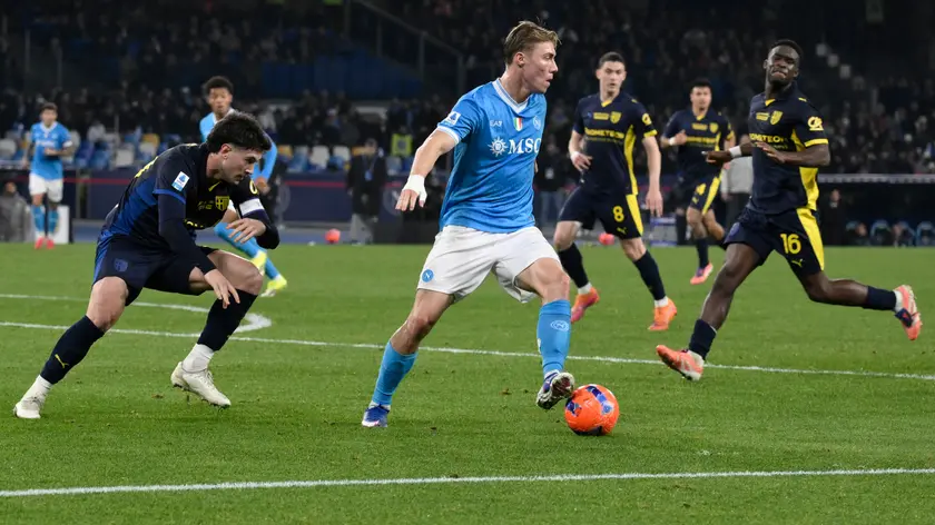 (ANSA) - NAPOLI, 14 GEN - Si chiude senza gol Napoli-Parma, primo dei quattro recuperi della 16/a giornata di serie A. Il Napoli preme per quasi tutto l'incontro ma senza riuscire a bucare la porta difesa dall'esordiente Rinaldi. Nel primo tempo, McTominay va anche in gol dopo una mischia in area, tutto vanificato però da un fuorigioco precedente di Mazzocchi. Nel finale il Parma è assediato ma resiste fino al 95', togliendo preziosi punti ad Antonio Conte, costretto in tribuna dalla squalifica. (ANSA).