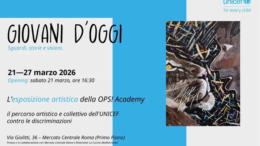 (ANSA) - ROMA, 21 MAR - L'Ufficio Unicef per l'Europa e l'Asia Centrale inaugura nel pomeriggio a Roma, al Mercato Centrale di via Giolitti, l'esposizione artistica 'Giovani d'Oggi' della Ops! Academy 2025/26, con le opere di 15 giovani migranti e rifugiati che hanno sviluppato creazioni artistiche sul tema delle discriminazioni e dell'inclusione. L'esposizione, aperta al pubblico fino al 27 marzo, viene lanciata in occasione della Giornata Internazionale per l'Eliminazione della Discriminazione Razziale che ricorre oggi. "Con la campagna Ops! vogliamo creare spazi reali di ascolto e partecipazione in cui ragazze e ragazzi possano raccontare la propria esperienza e contribuire a trasformare lo sguardo collettivo sulle nuove generazioni. 'Giovani d'oggi' mostra come l'arte possa diventare uno strumento potente di inclusione, dialogo e cambiamento sociale" afferma Nicola Dell'Arciprete Coordinatore della Risposta in Italia per l'Ufficio Unicef per l'Europa e l'Asia Centrale. La mostra - spiegano i promotori - propone un'esperienza immersiva che invita il pubblico ad ascoltare le voci dei giovani protagonisti, riflettere sui pregiudizi e immaginare possibili cambiamenti sociali attraverso l'arte e la narrazione. Le opere sviluppate dai giovani migranti e rifugiati, selezionati attraverso il contest DiscriminAZIONE promosso dall'Unicef sulla piattaforma U-Report On The Move nel 2025, sono state poi successivamente approfondite e rielaborate con il supporto di tutor, tra i quali studenti e studentesse dell'Istituto Europeo di Design e della Scuola Holden. (ANSA).