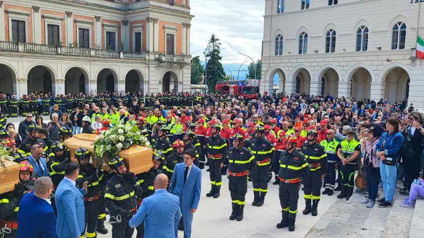 (ANSA) - CHIETI, 08 MAG - In una cattedrale di San Giustino gremita, oggi pomeriggio a Chieti l'arcivescovo Bruno Forte ha celebrato i funerali di Nico Civitella ed Emanuele Capone, i due vigili del fuoco di 42 anni morti annegati lo scorso 30 aprile durante un'escursione nella forra del fiume Avello a Pennapiedimonte, mentre due loro colleghi, Gabriele Buzzelli e Giulio De Panfilis sono stati salvati. Erano presenti i familiari e gli amici dei due vigili deceduti, il capo del Corpo nazionale dei Vigili del Fuoco, Eros Mannino, il sottosegretario dell'Interno, Emanuele Prisco, il deputato Alberto Bagnai, il procuratore capo della Repubblica di Chieti, Giampiero Di Florio, il presidente della Giunta regionale Marco Marsilio e del Consiglio, Lorenzo Sospiri, i sindaci di Chieti Diego Ferrara, di Guardiagrele Donatello Di Prinzio, di Pennapiedimonte Rosalina Di Giorgio, il prefetto Gaetano Cupello, i vertici provinciali delle forze dell'ordine e tantissimi vigili del fuoco in divisa e schierati in un picchetto d'onore. Le bare, giunte a ridosso della cattedrale su un'autoscala partita dalla caserma del comando provinciale, in cui è stata allestita la camera ardente, e poi portate a spalla dai colleghi all'interno della cattedrale attraverso la piazza, sono state accolte da applausi all'ingresso e all'uscita, con volo di palloncini bianchi, mentre il gruppo musicale di cui Capone faceva parte ha cantato i suoi due brani preferiti. Poco prima della conclusione del rito religioso ha preso la parola il comandante provinciale dei Vigili del fuoco di Chieti, Luca Verna. Rispondendo ai giornalisti prima della messa, Prisco ha espresso "vicinanza a dei colleghi e dei servitori dello Stato purtroppo caduti in conseguenza di questa disgrazia. Ci sembrava giusto assieme al capo del Corpo essere vicini al personale e alle famiglie". Riferendosi alla presenza dei rappresentanti di tutti i Corpi e di tutte le armi - "chi normalmente aiuta gli altri. l'affetto e la vicinanza è ricambiata e credo che le presenze di oggi dimostrino esattamente questo, una vicinanza umana al Corpo nazionale, alle famiglie delle vittime e un ritorno di quello che questi ragazzi hanno sempre dato nel loro servizio". (ANSA).