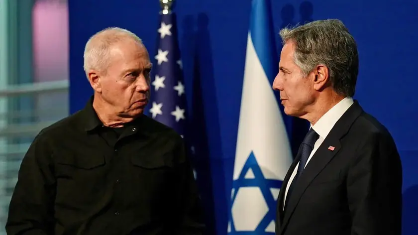 epa10922425 A handout photo made available by Israel's Ministry of Defense shows Israel's Minister of Defense Yoav Gallant (L) and US Secretary of State Antony Blinken (R) during a meeting at the Kirya, which houses the Israeli Ministry of Defense, in Tel Aviv, Israel, 16 October 2023. EPA/Ariel Hermoni HANDOUT HANDOUT EDITORIAL USE ONLY/NO SALES HANDOUT EDITORIAL USE ONLY/NO SALES