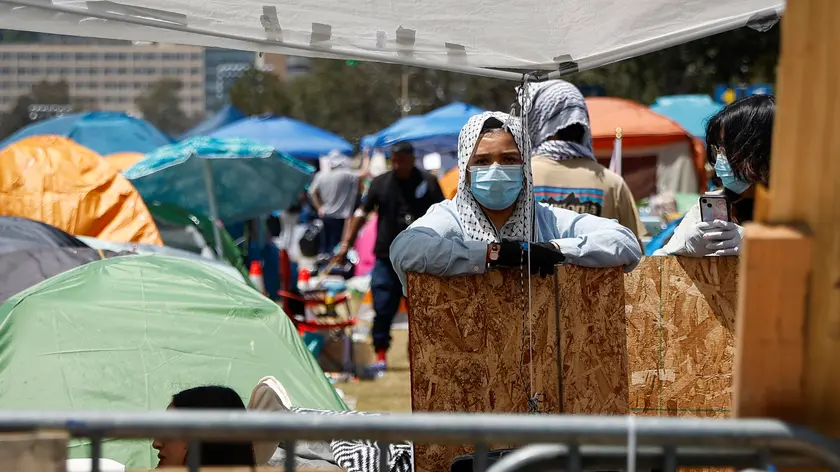 epa11313580 A person stands among the tents set up in an encampment of pro-Palestinian protesters on the campus of University of California Los Angeles (UCLA) in Los Angeles, California, USA, 01 May 2024. Nationwide protests have sprung up across the country on school campuses, many calling for institutions to divest investments in Israel and in support of a ceasefire in the Gaza conflict. EPA/CAROLINE BREHMAN
