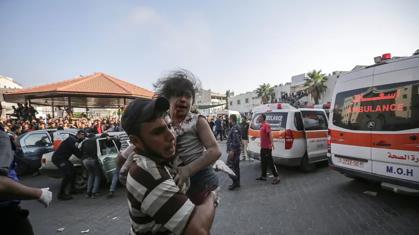 epa10918944 A Palestinian child injured in an Israeli rocket attack is rushed in to Al-Shifa hospital in Gaza City, 14 October 2023. The Israeli Defense Force (IDF) on 13 October called for the evacuation of all civilians of northern Gaza. Ahead of an expected ground invasion. More than 1,300 Israelis have been killed and over 3,200 others injured, according to the IDF, after the Islamist movement Hamas launched an attack against Israel from the Gaza Strip on 07 October. More than 2,000 Palestinians have been killed and over 8,700 others injured in Gaza since Israel launched retaliatory air strikes, the Palestinian health ministry said. EPA/HAITHAM IMAD