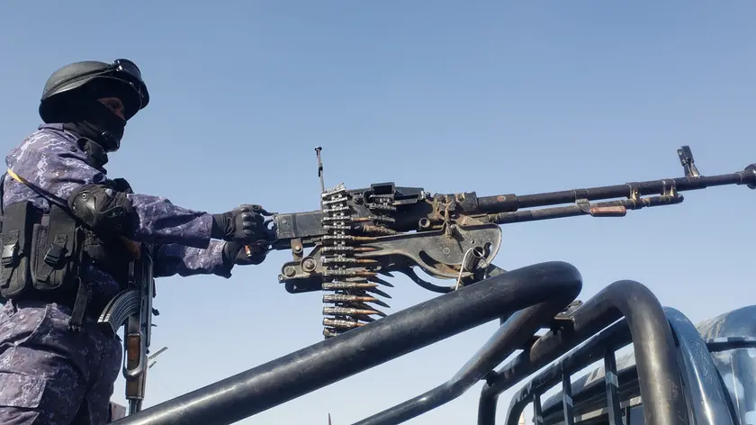 epa11071394 A Houthi soldier stands guard as people protest against a multinational operation to safeguard Red Sea shipping following Houthi attacks and the subsequent US and UK airstrikes on Houthis military sites, in Sanaa, Yemen, 12 January 2024. EPA/YAHYA ARHAB
