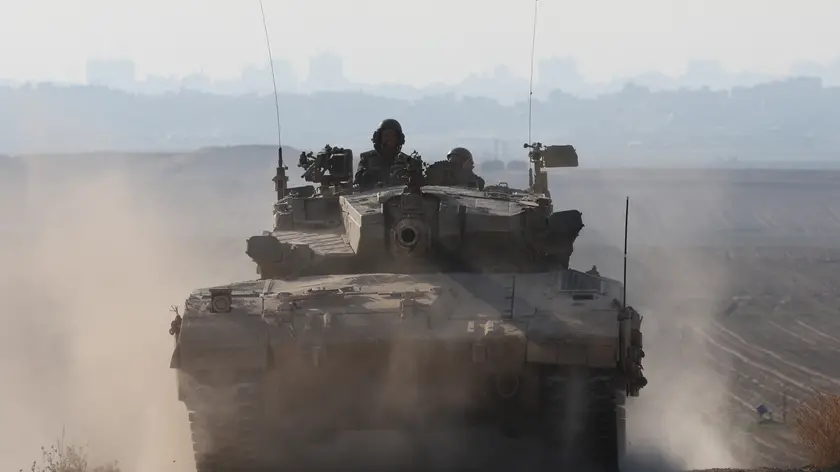 epa11264264 An Israeli army tank moves along the border with Gaza in southern Israel , 07 April 2024. Israel marks six months since the October 07 attacks, as 134 hostages are currently still being held captive in Gaza, according to the Israeli IDF. More than 33,000 Palestinians and over 1,450 Israelis have been killed, according to the Palestinian Health Ministry and the Israel Defense Forces (IDF), since Hamas militants launched an attack against Israel from the Gaza Strip on 07 October 2023, and the Israeli operations in Gaza and the West Bank which followed it. EPA/ABIR SULTAN