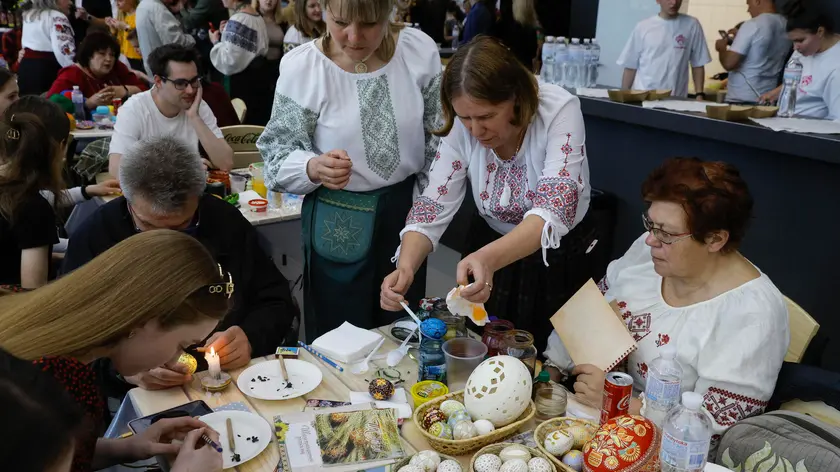 epa11310704 Ukrainians paint eggs during the Easter Eggs Festival in Kyiv, Ukraine, 30 April 2024. Eastern Orthodox believers will celebrate Easter Day on 05 May 2024. EPA/SERGEY DOLZHENKO