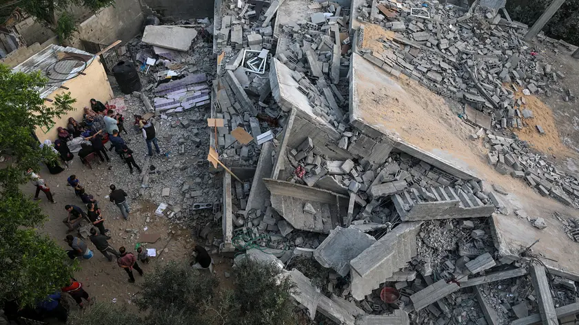 epa10628563 Palestinians from the Abu-Nabhan family gather near the rubble of their destroyed family house, following Israeli strikes in Jabaliya town, northern Gaza Strip, 14 May 2023. Israel and Islamic Jihad movement agreed to an Egyptian-brokered truce late 14 May. Israel has carried out several attacks against the military leadership of the Palestinian Islamic Jihad movement, in retaliation to rockets being fired towards Israel from in the Gaza Strip. EPA/MOHAMMED SABER