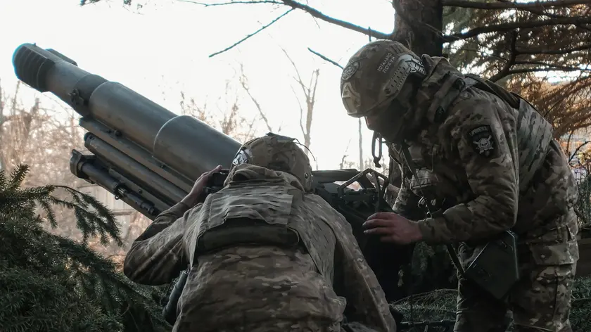 epa11185871 Ukrainian servicemen from the assault brigade 'Bureviy' (Hurricane), a unit of the Ukrainian National Guard, shoot the 105 mm Italian OTO Melara Mod 56 Pack Howitzers from their positions in the Avdiivka direction, at an undisclosed location in the Donetsk area, eastern Ukraine, 27 February 2024 (issued 28 February 2024). Russian troops entered Ukraine on 24 February 2022 starting a conflict that has provoked destruction and a humanitarian crisis. EPA/VITALII NOSACH