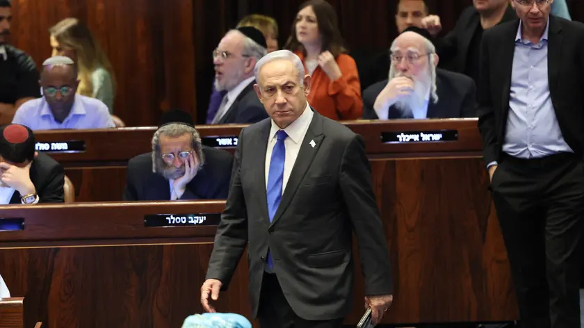 epa11403058 Israeli Prime Minister Benjamin Netanyahu (C) attends the Knesset plenum vote on the ultra-Orthodox conscription to military service law, in the Knesset, Israeli parliament in Jerusalem, 10 June 2024. The Knesset vote on the controversial exemption for ultra-Orthodox Yeshiva students from military conscription. Israel’s Supreme Court heard on 02 June a response by the state over the ultra-Orthodox recruitment issue, after previously extending a deadline for the government to present a conscription plan for ultra-Orthodox Jews, who are traditionally exempt from military service. EPA/ABIR SULTAN