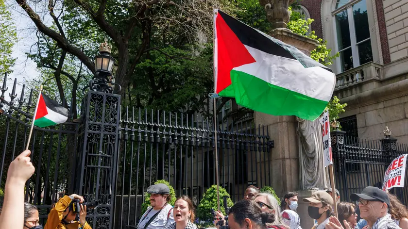 epa11310847 Students and other supporters of pro-Palestine students gather outside Columbia University campus, hours after students took over Hamilton Hall, in New York, New York, USA, 30 April 2024. Columbia University shut down its campus on 30 April in response to the take over. Students have been protesting the university's investments in Israel and showing their support for Palestine for over two weeks, also inspiring other students nationwide to do the same. EPA/SARAH YENESEL