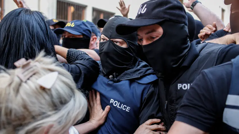 epa11312761 Georgian opposition party supporters clash with police during a protest against a draft bill on 'foreign agents' near the Parliament in Tbilisi, Georgia, 01 May 2024. The Georgian parliament adopted the bill on foreign agents in the first reading amidst mass protests in Tbilisi. Georgian Prime Minister Kobakhidze called on law enforcement officers to show maximum patience at protests against the 'foreign agents' law. According to Kobakhidze, the ruling Georgian Dream party will pass the bill despite the protests. During the dispersal of the protest near the Georgian parliament, 63 people were detained and six police officers were injured, the Ministry of Internal Affairs reported. EPA/DAVID MDZINARISHVILI