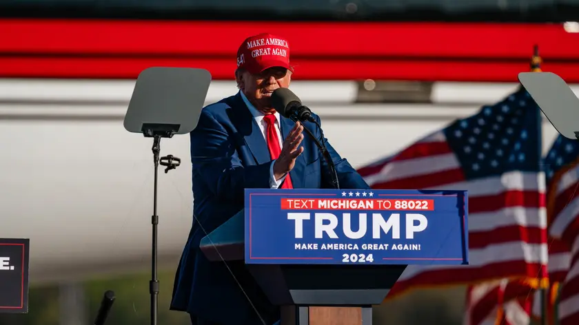 epa11313524 Former US President Donald J. Trump speaks during a campaign rally at an airport in Freeland, Michigan, USA, 01 May 2024. Trump is holding rallies with supporters in Michigan and in Wisconsin today as his ongoing criminal trial in New York is not held on Wednesdays. EPA/NICK HAGEN