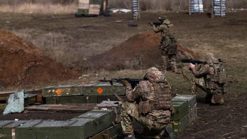 epa11228419 Ukrainian servicemen from the assault unit of the 72nd Mechanized Brigade named after the Black Zaporozhians take part in military training at an undisclosed location near the frontline, Donetsk region, eastern Ukraine, 18 March 2024, amid the Russian invasion. Russian troops entered Ukraine in February 2022 starting a conflict that has provoked destruction and a humanitarian crisis. EPA/OLGA KOVALOVA