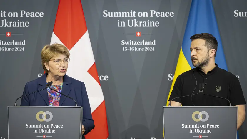 epa11415050 Swiss Federal President Viola Amherd (L) and Ukrainian President Volodymyr Zelensky attend the closing press conference of the Summit on peace in Ukraine in Stansstad near Lucerne, Switzerland, 16 June 2024. International heads of state gather on 15 and 16 June at the Buergenstock Resort in central Switzerland for the two-day Summit on Peace in Ukraine. EPA/URS FLUEELER / POOL EDITORIAL USE ONLY