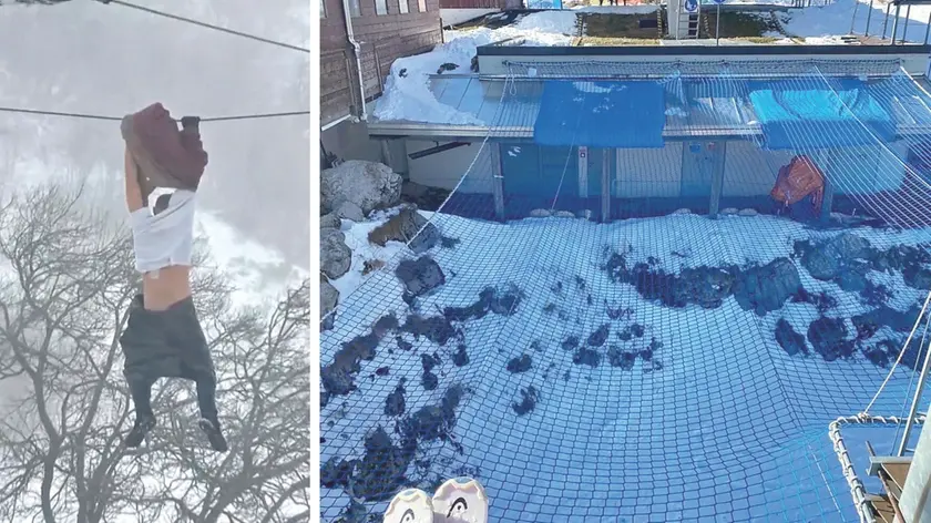 Il 32enne aggrappato a un cavo prima della caduta e la rete di protezione della seggiovia